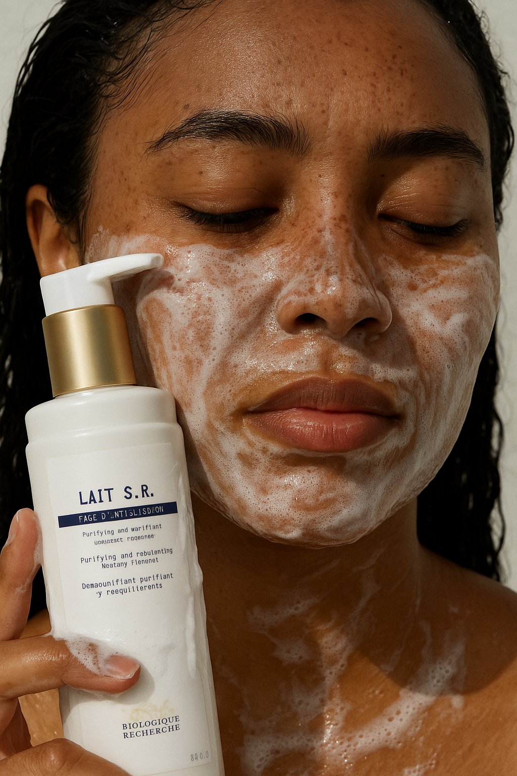 Apply a small amount to face, neck, and décolleté. Emulsify with gentle smoothing motions, then remove with a damp cloth. Repeat if necessary.