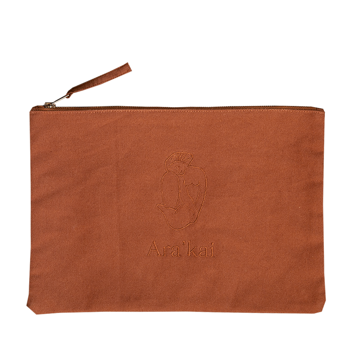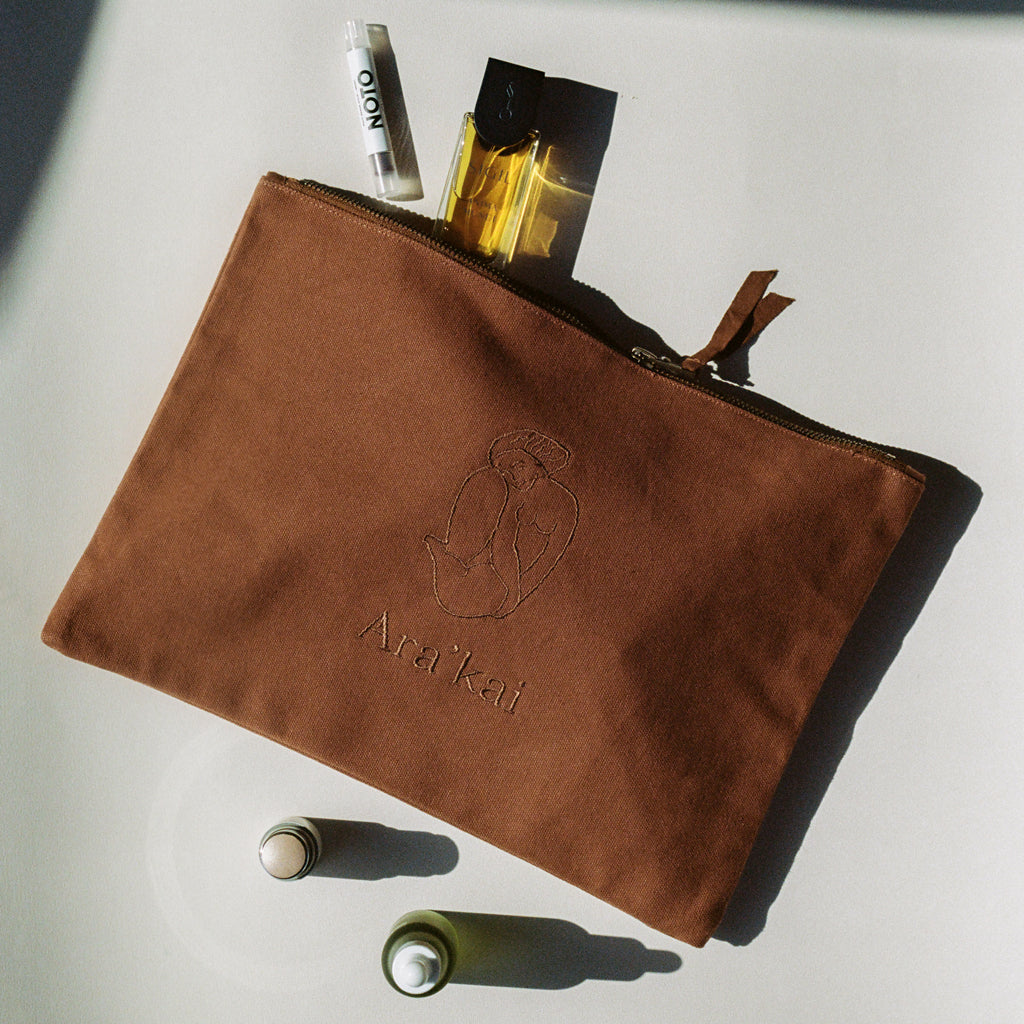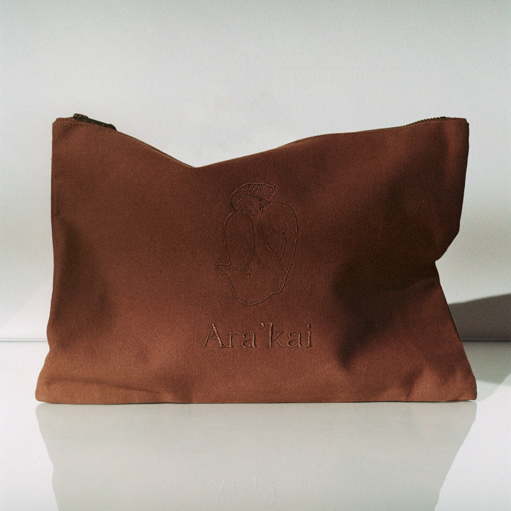 The Ara’kai Collection Everything Pouch holds all your essentials, functioning as both a toiletry bag and a laptop pouch. Made from 100% organic cotton, this multitasking zip pouch features our signature Ara’kai embroidery in a neutral brown tone.